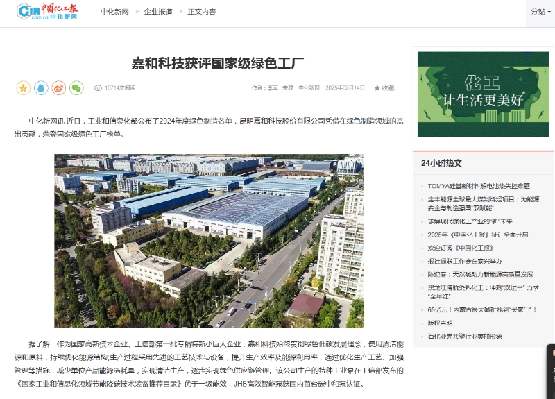 中化新網訊,近日,工業和信息化部公布了2024年度綠色制造名單,昆明嘉和科技股份有限公司憑借在綠色制造領域的本出貢獻,榮登國家級綠色工廠榜單。