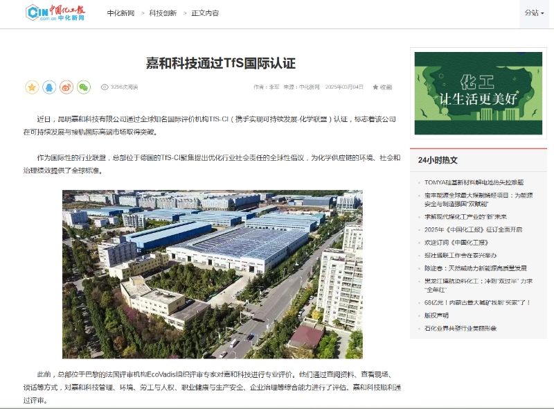 近日,昆明嘉和科技有限公司通過全球知名國際評價機構TfS-(1(攜手實現可持續發展-化學聯盟)認證,標志著該公司在可持續發展與接軌國際高端市場取得突破。