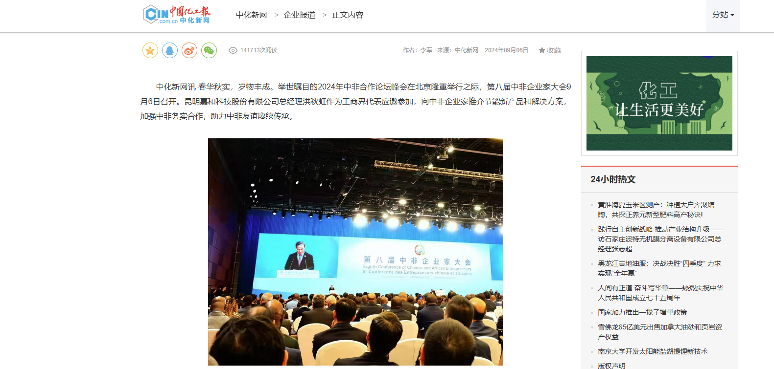 中化新網訊春華秋實,歲物豐成。舉世矚目的2024年中非合作論壇峰會在北京隆重舉行之際,第八屆中非企業家大會9月6日召開。昆明嘉和科技股份有限公司總經理洪秋虹作為...