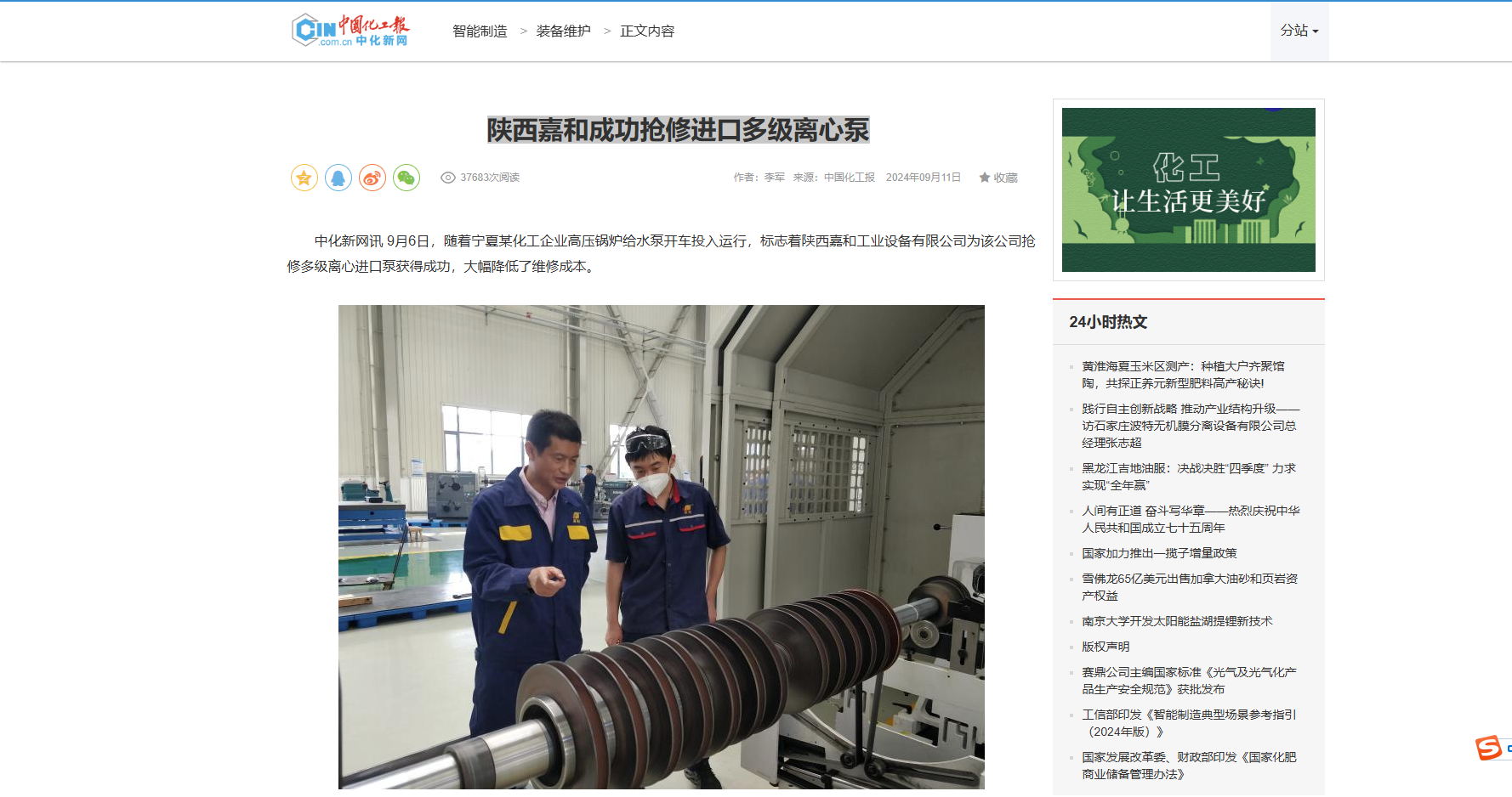 中化新網訊9月6日,隨著寧夏某化工企業高壓鍋爐給水泵開車投入運行,標志著陜西嘉和工業設備有限公司為該公司搶修多級離心進口泵獲得成功,大幅降低了維修成本。