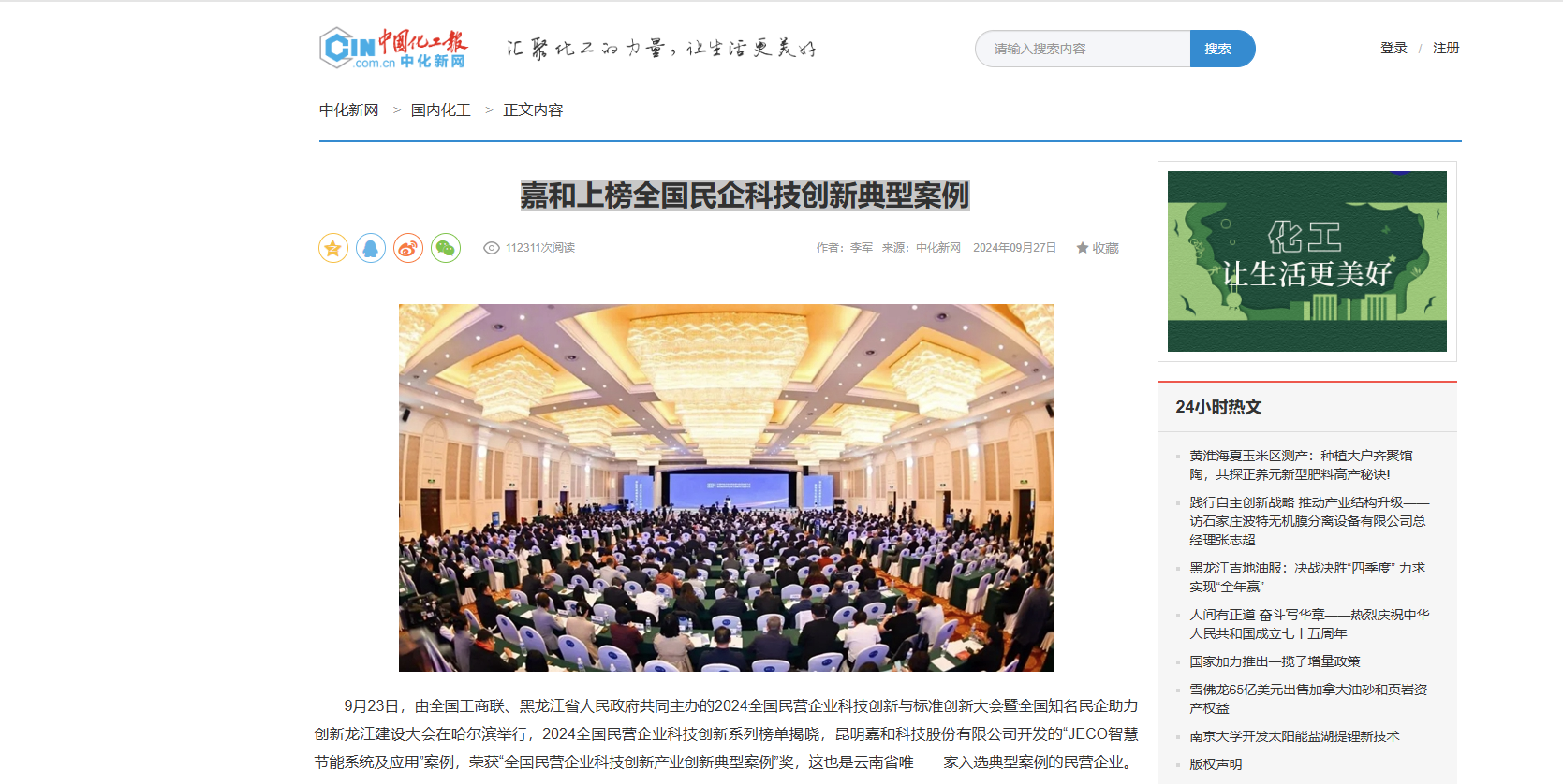 9月23日,由全國工商聯、黑龍江省人民政府共同主辦的2024全國民營企業科技創新與標準創新大會暨全國知名民企助力創新龍江建設大會在哈爾濱舉行,2024全國民營企...