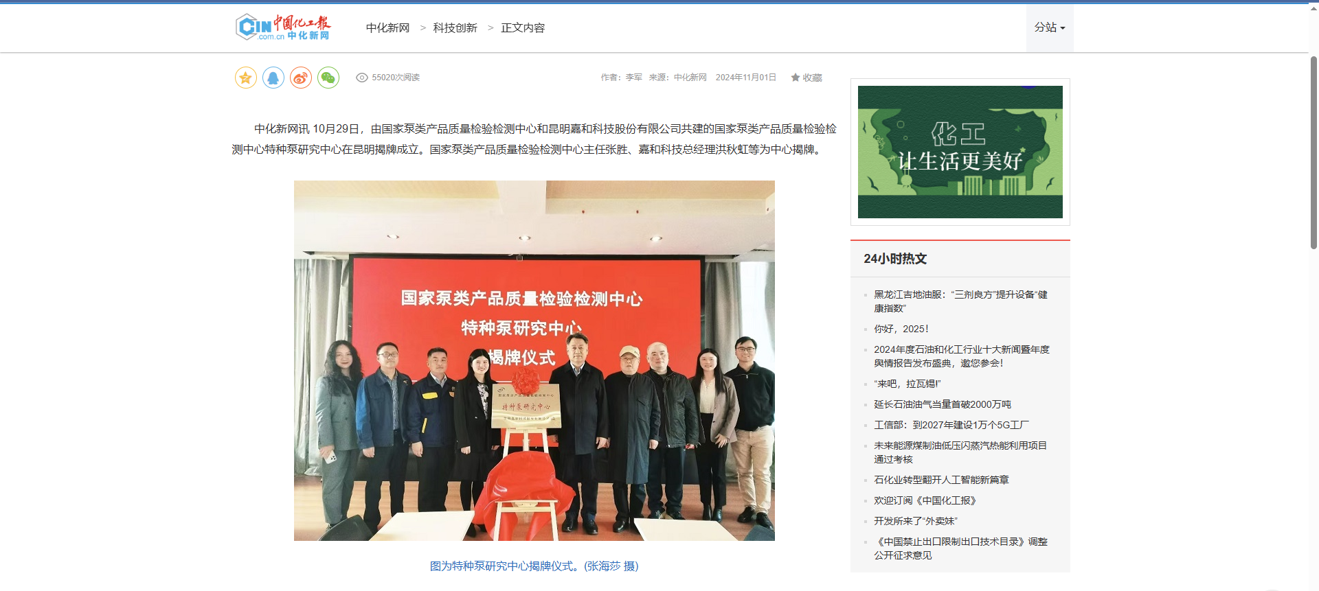 中化新網訊10月29日,由國家泵類產品質量檢驗檢測中心和昆明嘉和科技股份有限公司共建的國家泵類產品質量檢驗檢測中心特種泵研究中心在昆明揭牌成立。國家泵類產品質量...