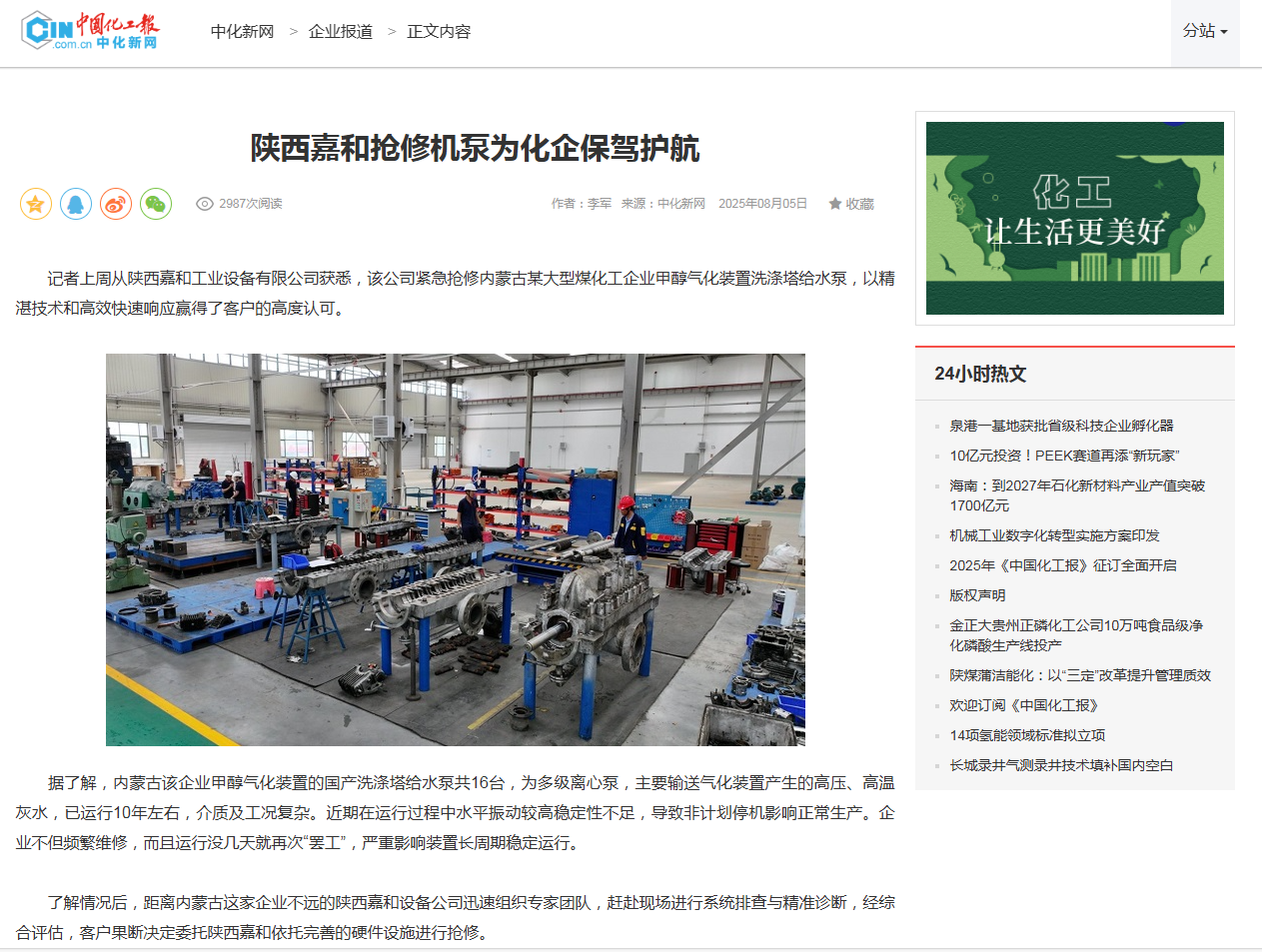 記者上周從陜西嘉和工業設備有限公司獲悉,該公司緊急搶修內蒙古某大型煤化工企業甲醇氣化裝置洗滌塔給水泵,以精湛技術和高效快速響應贏得了客戶的高度認可。