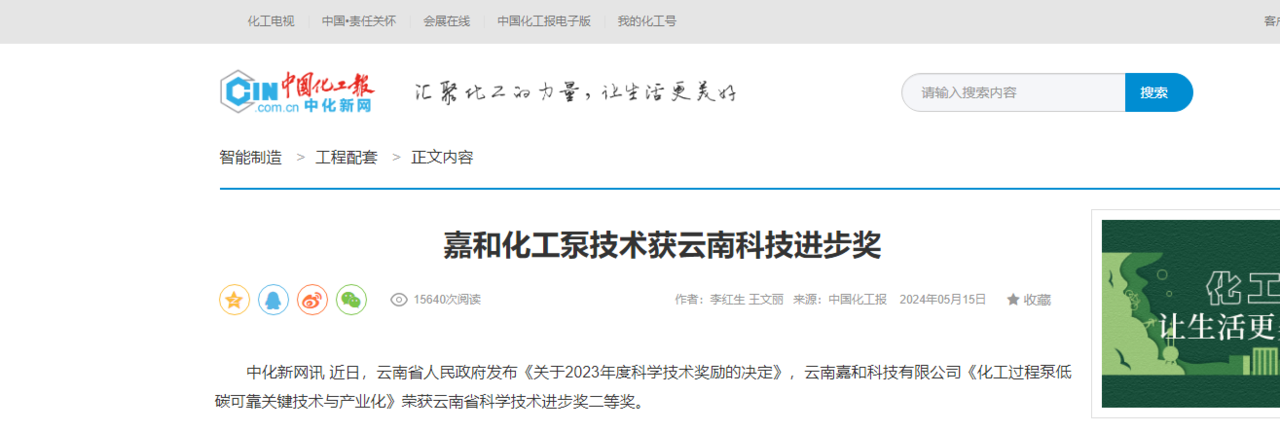 嘉和化工泵技術獲云南科技進步獎